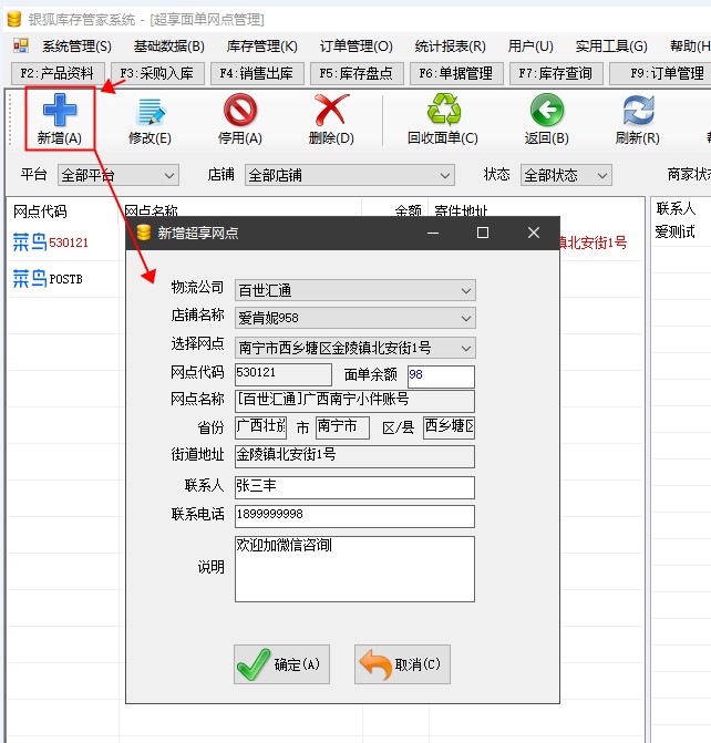 进入网点管理窗口后,点【新增】按钮,按提示选择好要分享面单的网点即可。