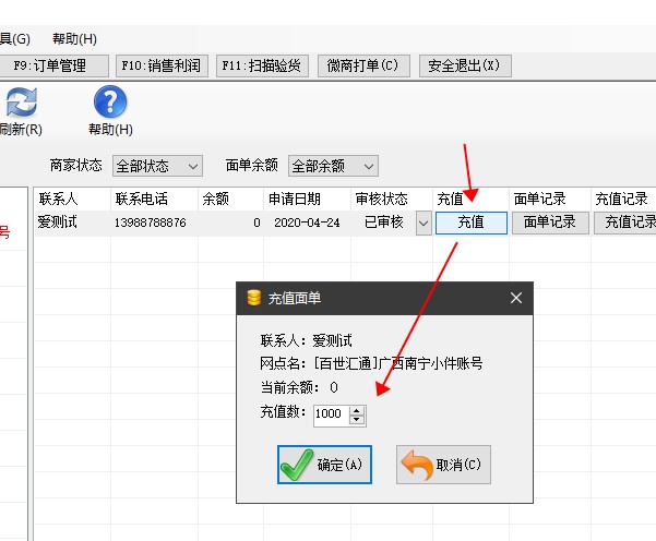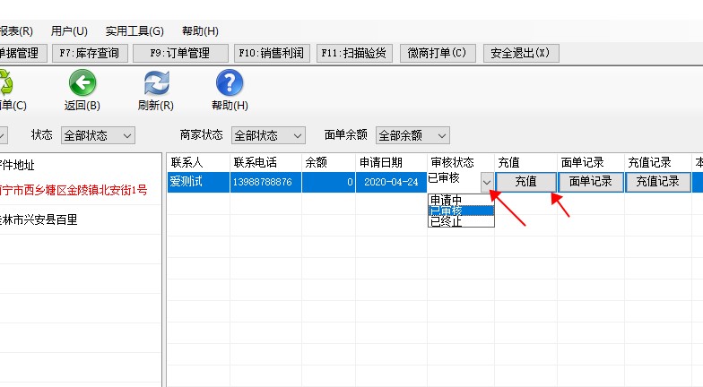 窗口右侧可能看到该网点下所有申请的商家,审核列下拉审核后,可以充值面单。