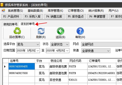 切换到【派发的单号】选项页,可以组合各种查询条件来查询面单。