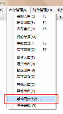 1)、从主菜单选择【库存管理】->【手动同步库存】,如下图所示